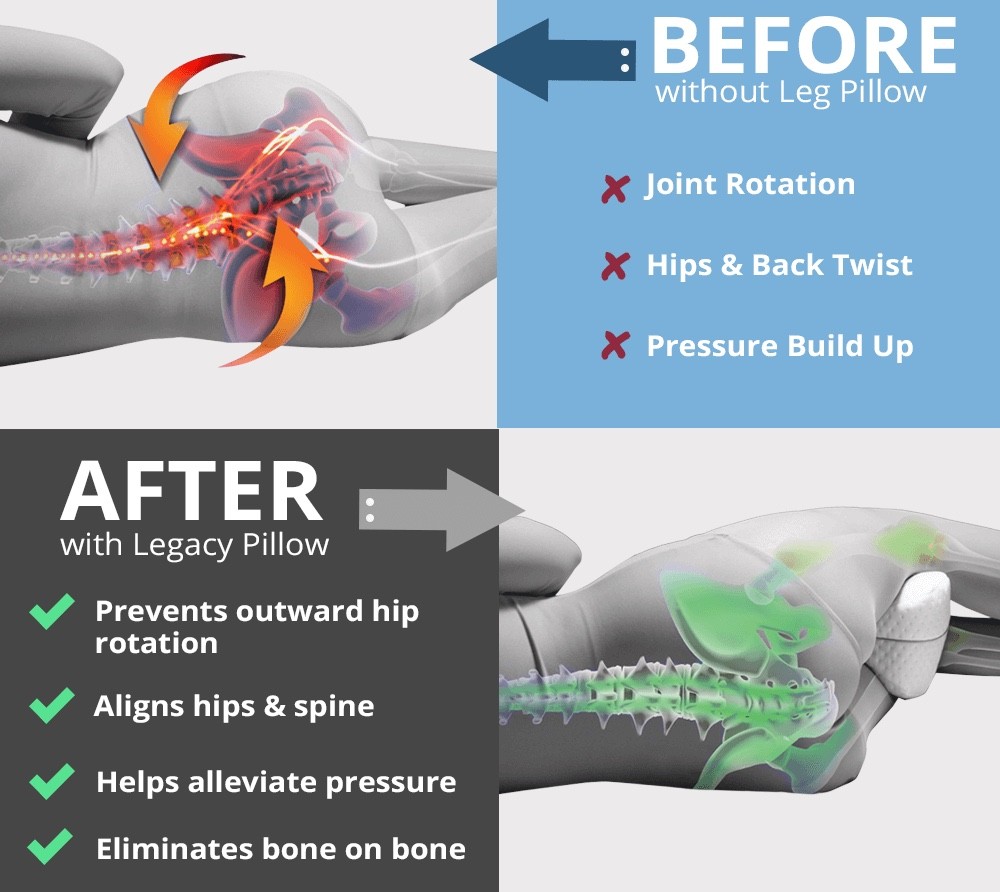 • Side sleepers — Side-sleeping can put pressure on your spine, hips, and sciatic. The contour pillow cushions your knees and cradles your legs, relieving stress on joints while restoring your lower back alignment to help alleviate back, hip, leg, knee and sciatic nerve discomfort.